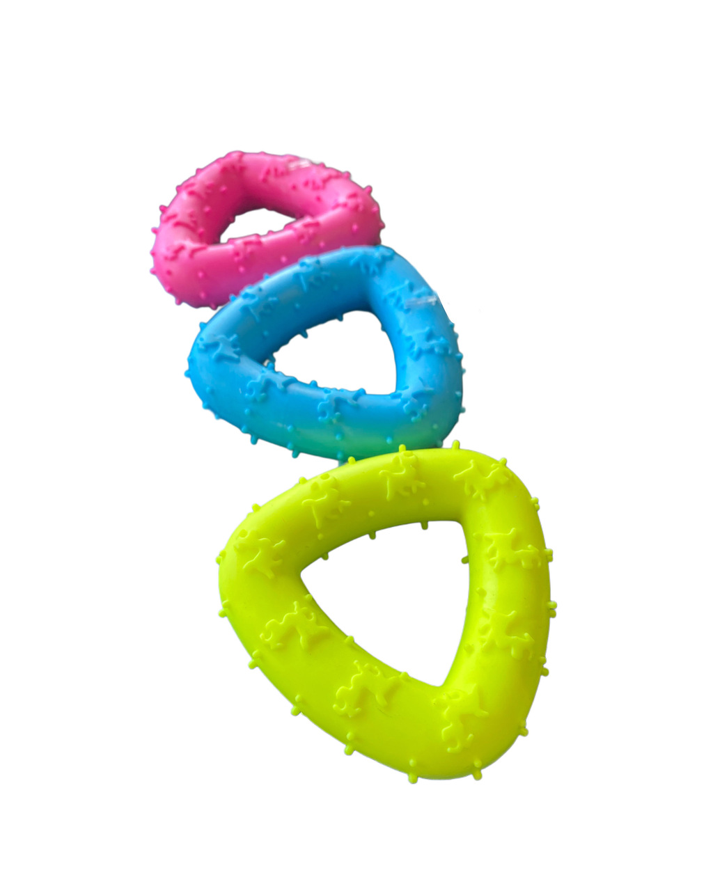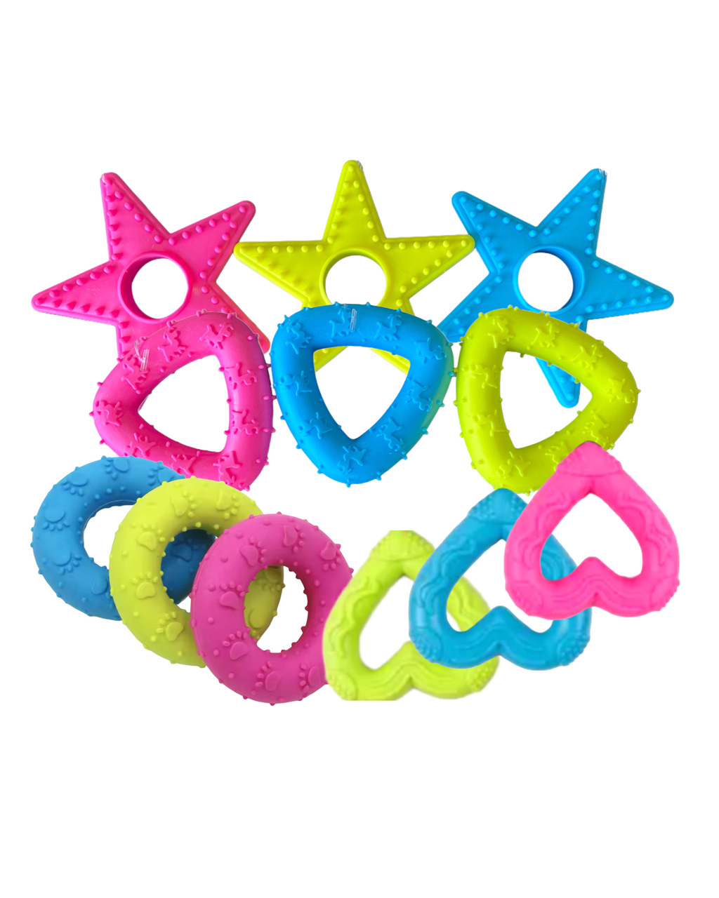 ¡Presentamos el Súper Pack de 12 Juguetes de Goma! Este pack incluye una variedad de juguetes de goma TPR en formas de corazones, estrellitas, aros, triangulitos, huesitos y peces! Todos diseñados para que tu mascota se divierta a lo grande.